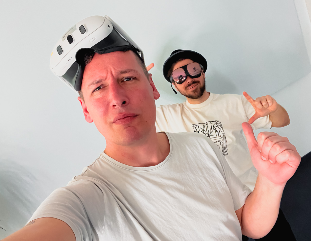 Das ist der Sticker, den wir auf unser Studio kleben. Das ist unsere Herkunft aus der Street Art, Nullen und Einsen. Das sind alle (drei) Realitäten in denen wir uns bewegen und die Technologien mit der wir die Brücke schlagen. Einfach gesagt es ist: 👾🛹